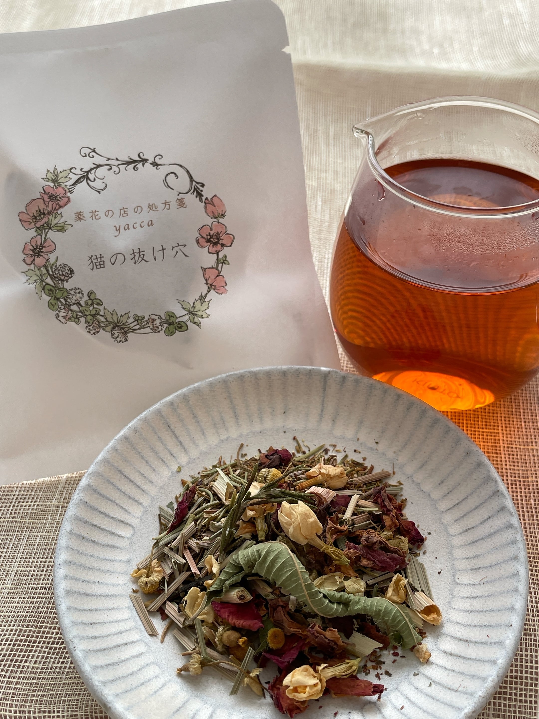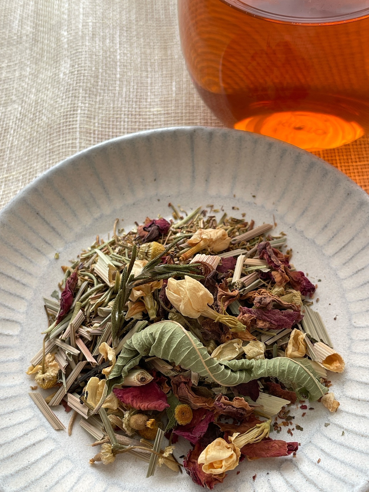 埼玉レモングラス・有機グリーンルイボス・リンデンフラワー・埼玉レモンバーベナ・有機葡萄葉・埼玉ローズマリー・鹿児島マルベリー・ジャーマンカモミール・ジャスミン・有機ローズ